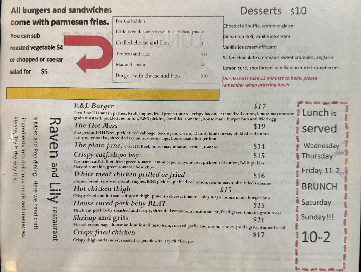 Welcome to Raven & Lily Court, a culinary gem nestled in the heart of Somerville, TN. This quaint eatery not only promises a delightful atmosphere but also boasts top-notch service that makes each visit memorable. With a menu that creatively marries flavors, highlights include the crispy catfish served atop creamy grits and seasoned greens, alongside the highly praised redfish special drizzled with parsley sauce. Guests rave about Chef Justin’s talent, especially his pimento cheese balls and freshly made pork rinds. Portions here are generous, earning accolades for their value and taste. Indulge your sweet tooth with the magical chocolate soufflé, a must-try finale. Whether you're a local or just passing through, Raven & Lily Court is a dining experience that supports the community and showcases the best of regional cuisine. Join the many satisfied diners who have made this vibrant spot their go-to for incredible food.